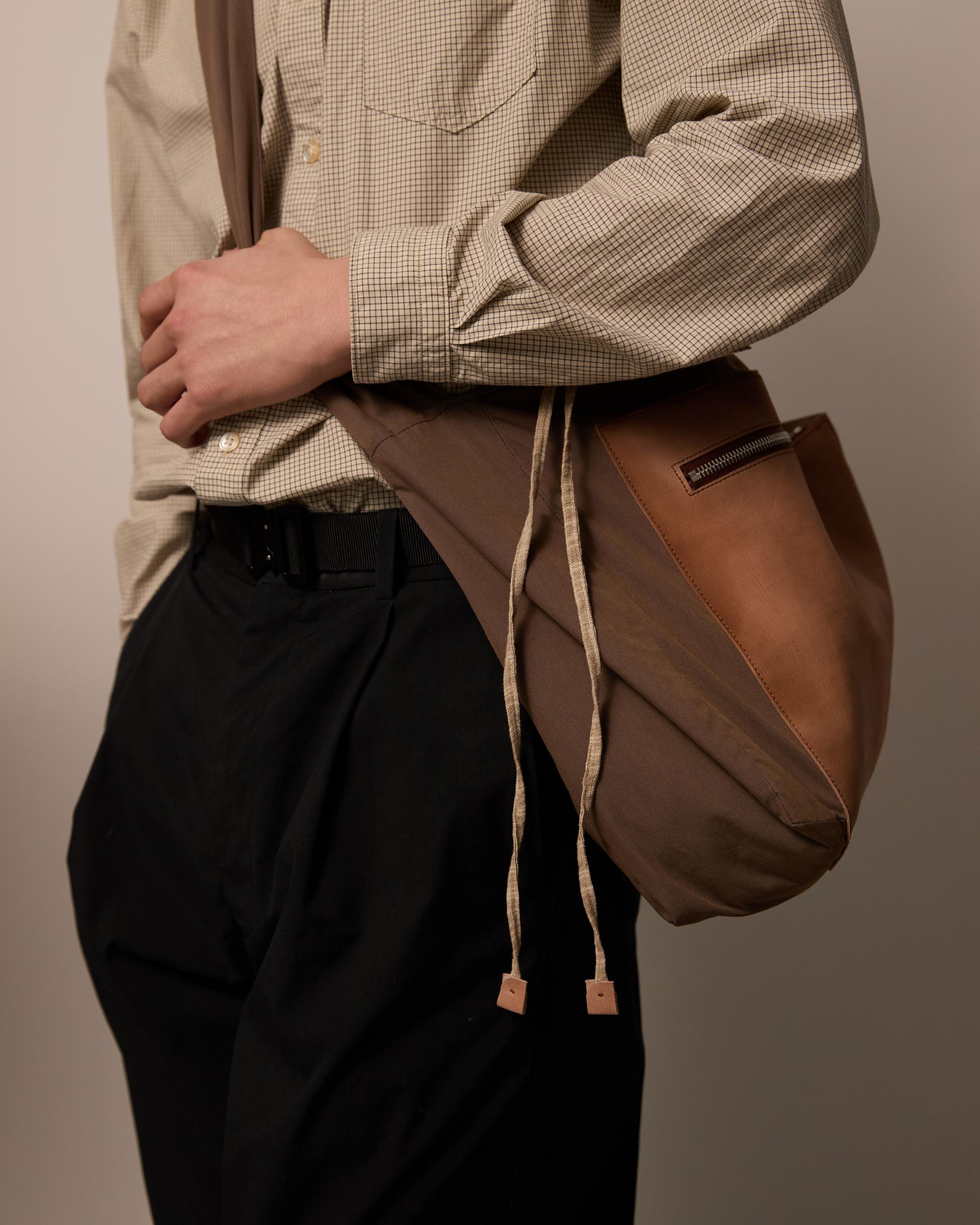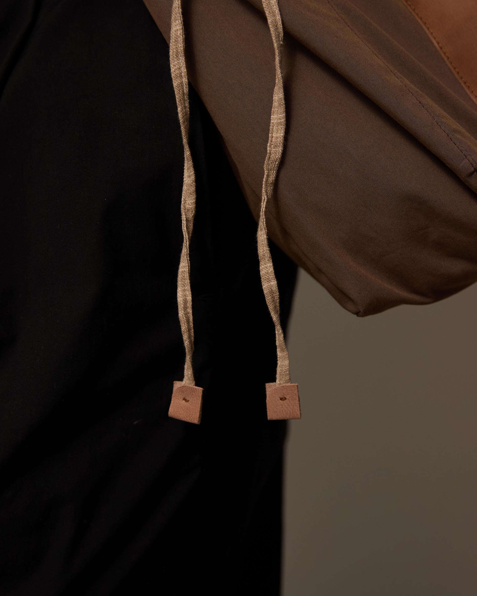 체크 무늬의 거즈 소재 그리고 왁스 가공된 양가죽을 조합하였으며